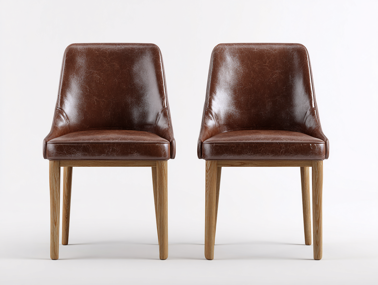L'assise et le dossier sont revêtus de cuir synthétique marron à l'aspect légèrement patiné, offrant un rendu chaleureux et facile à entretenir. La structure repose sur des pieds en bois massif à finition naturelle, garantissant stabilité et résistance pour un usage fréquent.