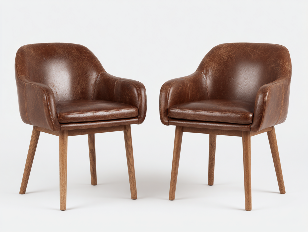 L'assise et le dossier sont recouverts de cuir synthétique marron, avec une finition lisse et soignée. Les pieds en bois massif assurent une bonne stabilité et apportent une touche chaleureuse et naturelle à l'ensemble.