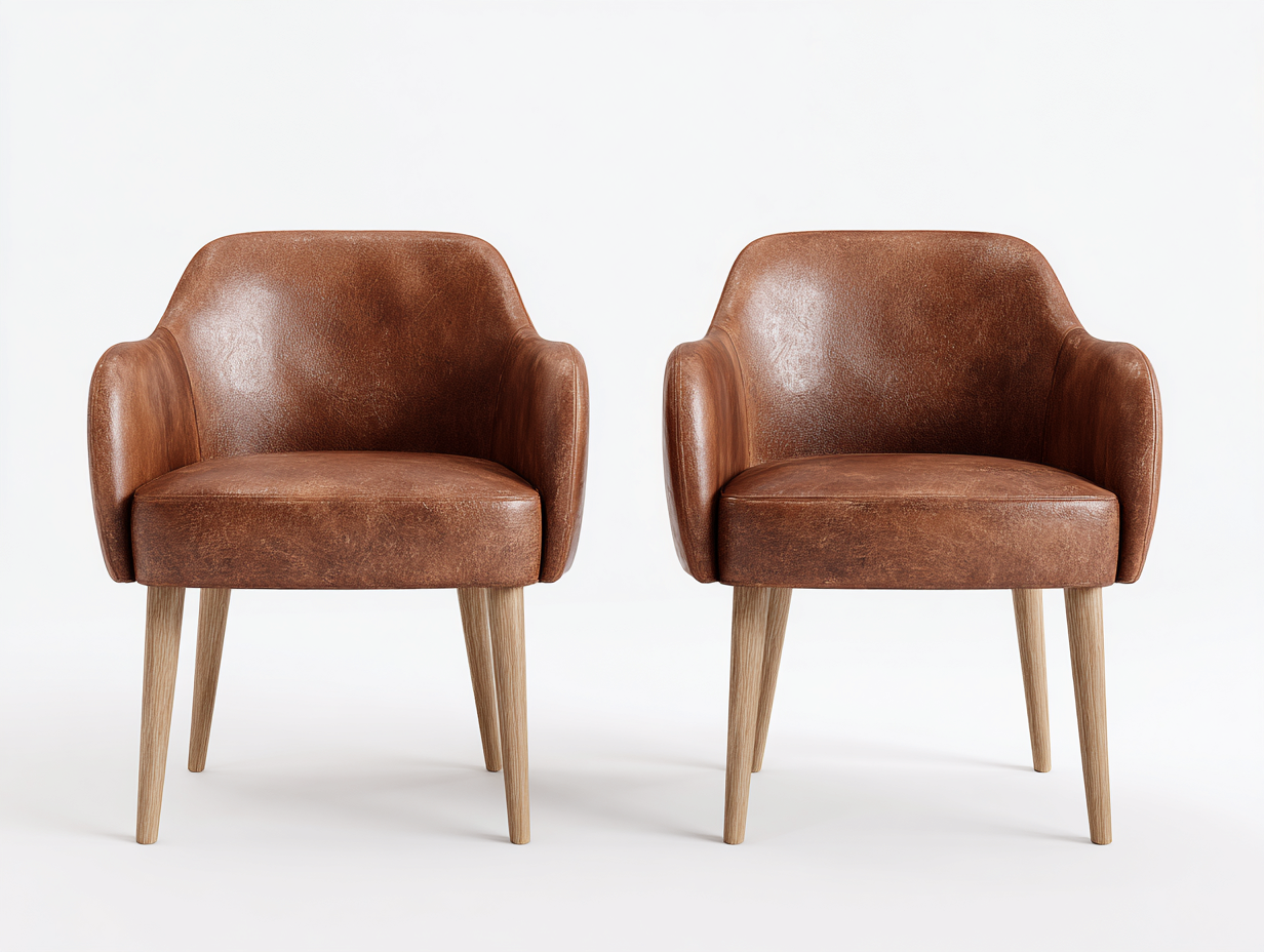 L'assise et le dossier sont revêtus de cuir synthétique marron, présentant un aspect légèrement patiné et une surface facile à entretenir. La structure repose sur des pieds en bois massif, assurant stabilité et résistance pour une utilisation régulière.